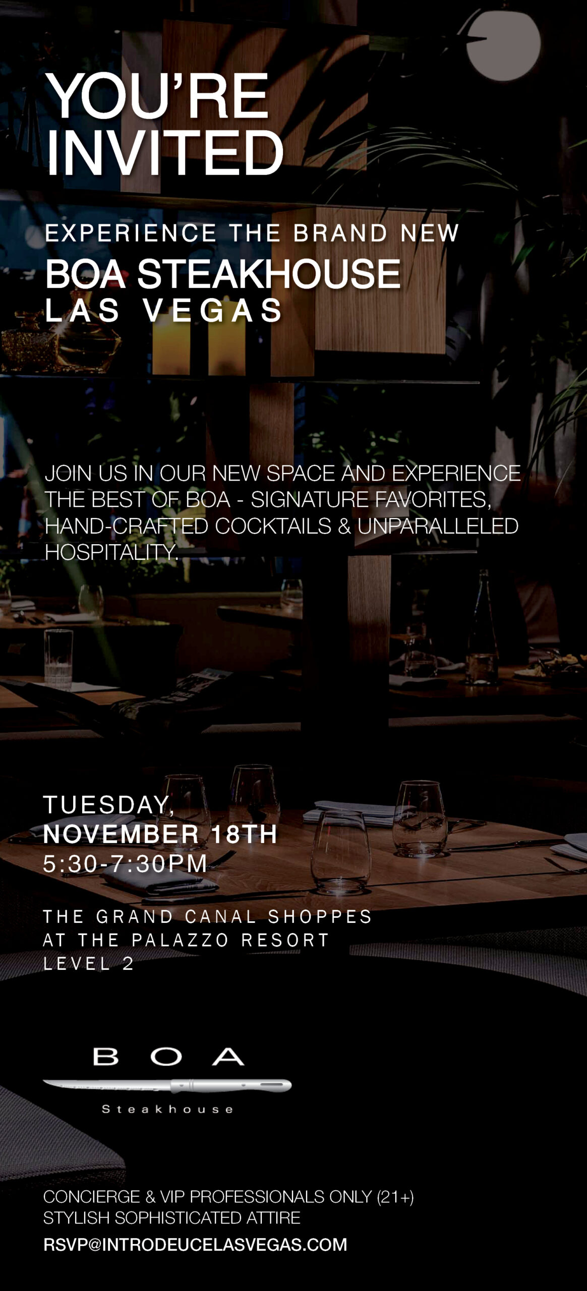 INTRODeuce Las Vegas is thrilled to invite you to the Hospitality Grand Opening of BOA Steakhouse Las Vegas on Tuesday, November 18th from 5:30pm-7:30pm! Join us for an unforgettable evening as we celebrate the launch of BOA’s newest location in the heart of the city. Mix and mingle in the restaurant’s stunning new ambiance while enjoying signature hand-crafted cocktails and delicious hors d’oeuvres. The evening will feature special INTROductions & exciting grand raffle prizes. Be among the first to experience BOA’s elevated dining experience in Las Vegas.