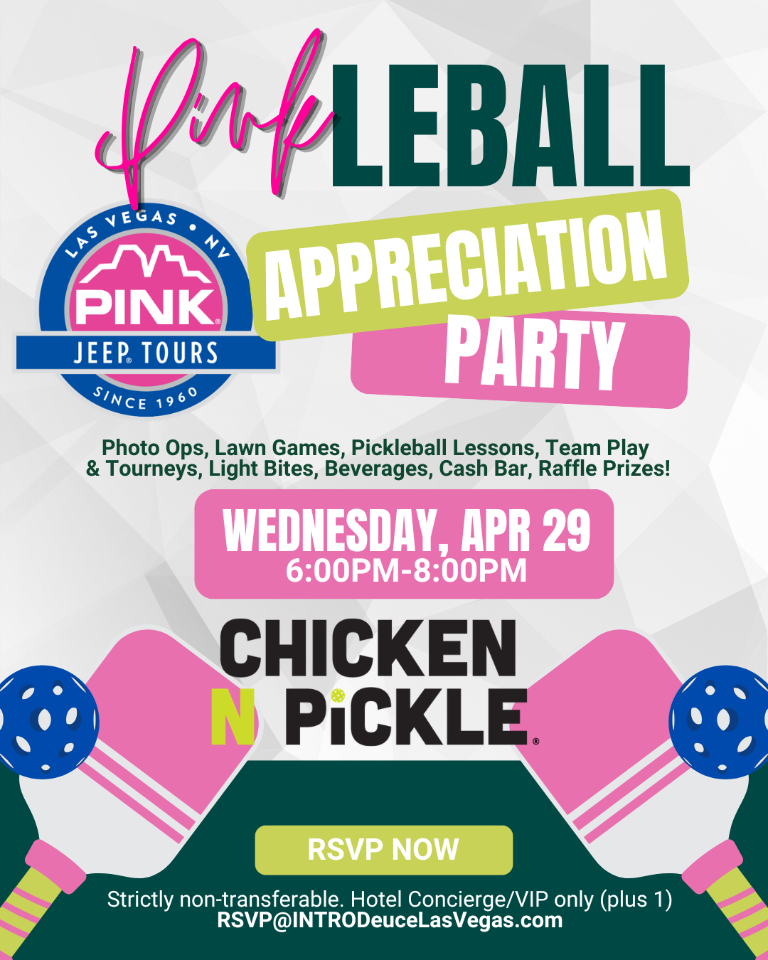 INTRODeuce Las Vegas invites you to the Annual Pink Jeep Tours Hospitality Appreciation Party at Chicken N Pickle! Hotel Concierge & VIP Members* are invited to join us on Wednesday, April 30th from 6:00pm-8:00pm. Get ready to Serve, Volley, and Smash your way to Victory in the most exciting PINKleball Appreciation Party of the year! Join us at Chicken N Pickle for fun Lawn Games, Pickleball Pros – Lessons, Tourney’s & Team Play plus, Photo Ops with PINK Jeeps, Grand Raffle Prizes, Tasty Light Bites and Ice-Cold Beverages (cash bar also available). Summer Casual Attire but please wear PINK to celebrate the occasion.